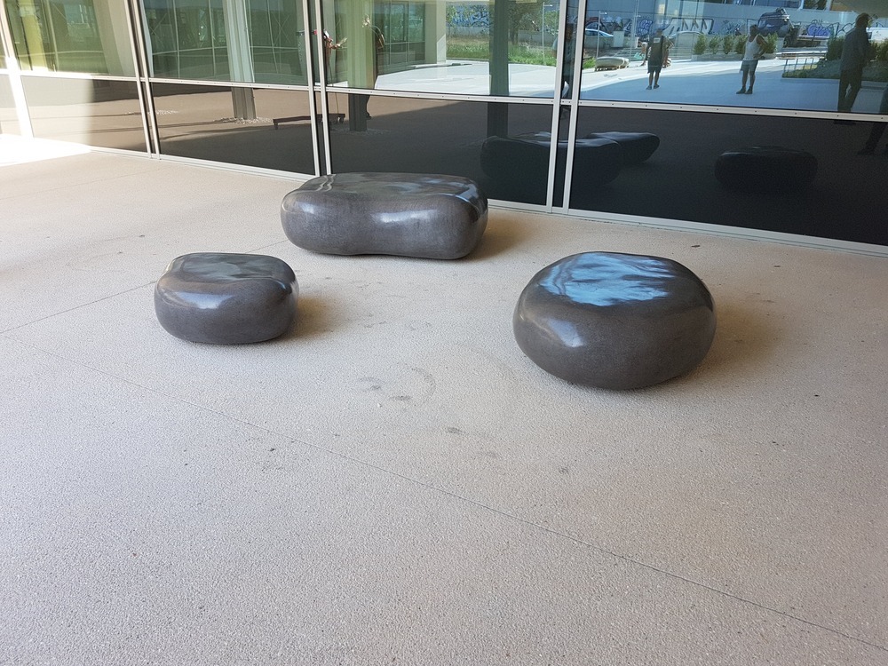 Η κατασκευή περιλαμβάνει τρία μαύρα βότσαλα, τριών διαφορετικών μεγεθών: Χsmall – Small – Medium και τρία βότσαλα σε γκρι -μπεζ, τριών διαφορετικών μεγεθών πάλι: Large – medium – xsmall.