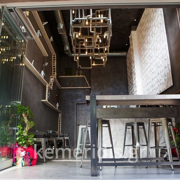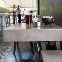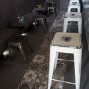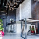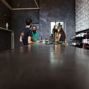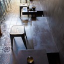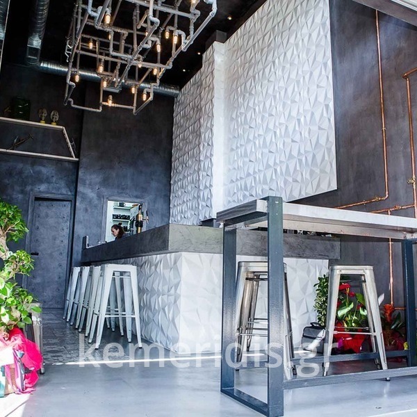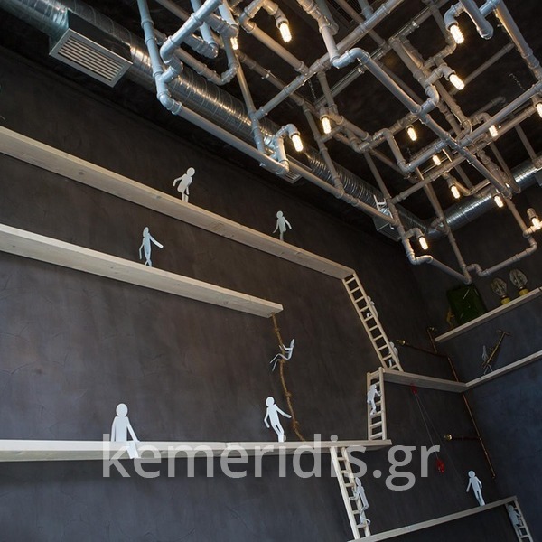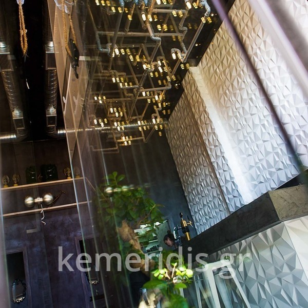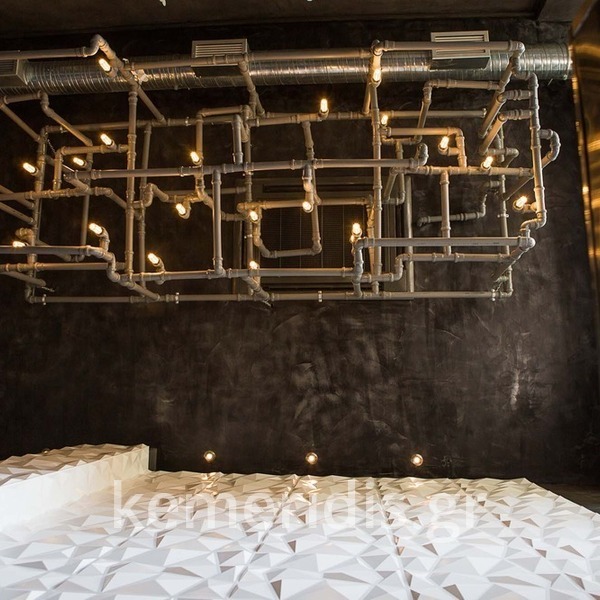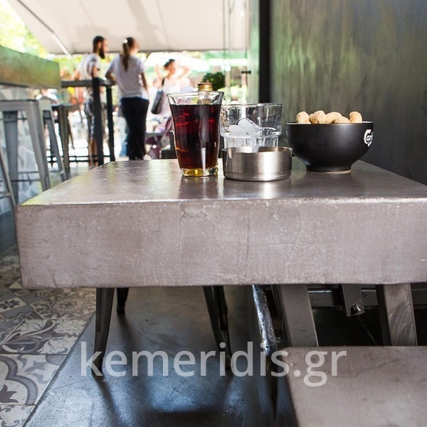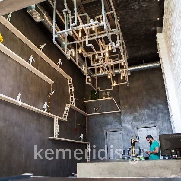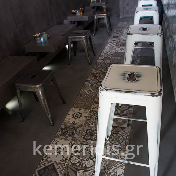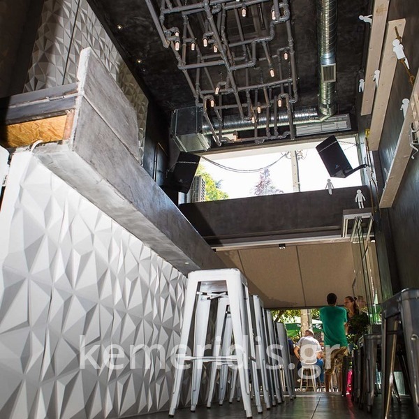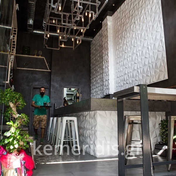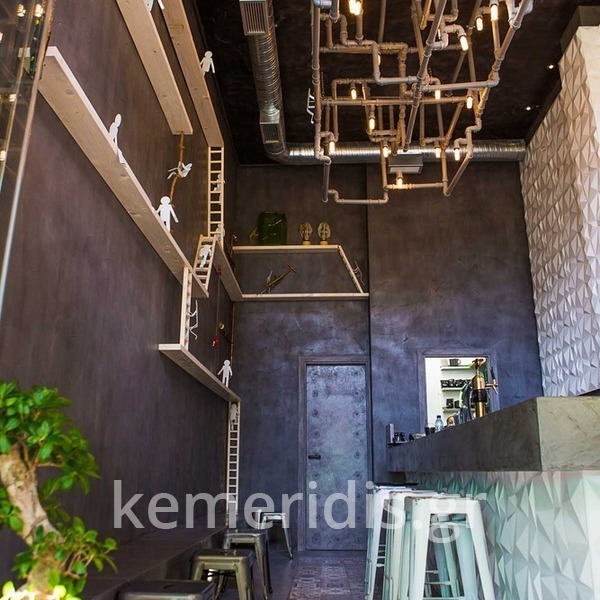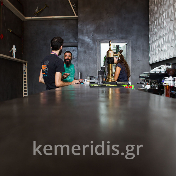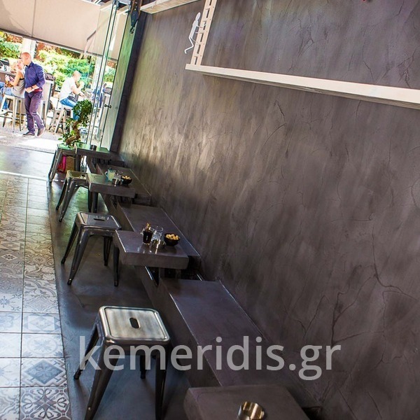 Σε χώρο μαζικής εστίασης στο Μοσχάτο με την ονομασία "ΑΠΟΘΗΚΗ" κατασκευάσαμε πάγκο καθιστικού που όταν θέλεις τραπεζάκια αυτά ανασηκώνονται, και τα επιχρίσαμε με πατητή τσιμεντοκονία. Κατασκευάσαμε τον πάγκο του μπαρ και τοποθετήσαμε τρισδιάστατα πάνελ στα τοιχώματα και στον πάγκο έγινε διάστρωση με πατητή τσιμεντοκονία.