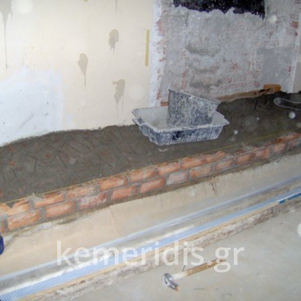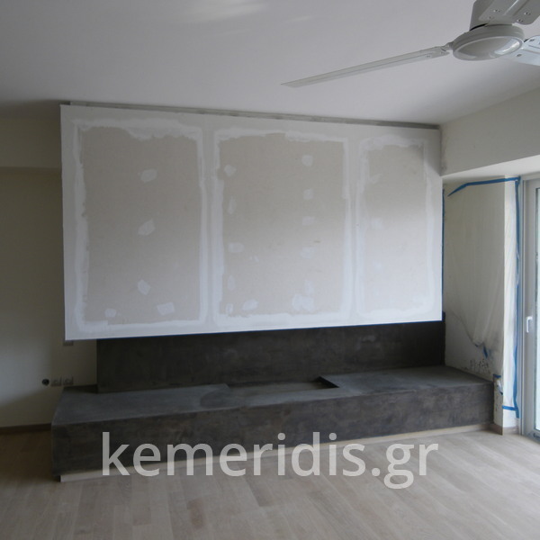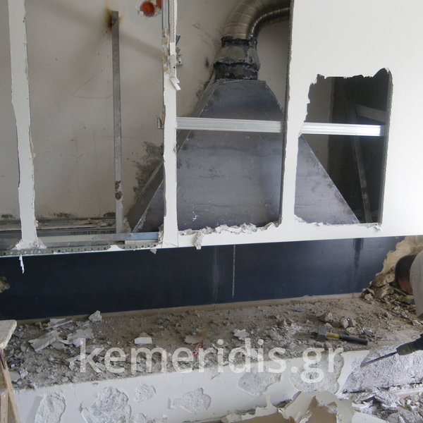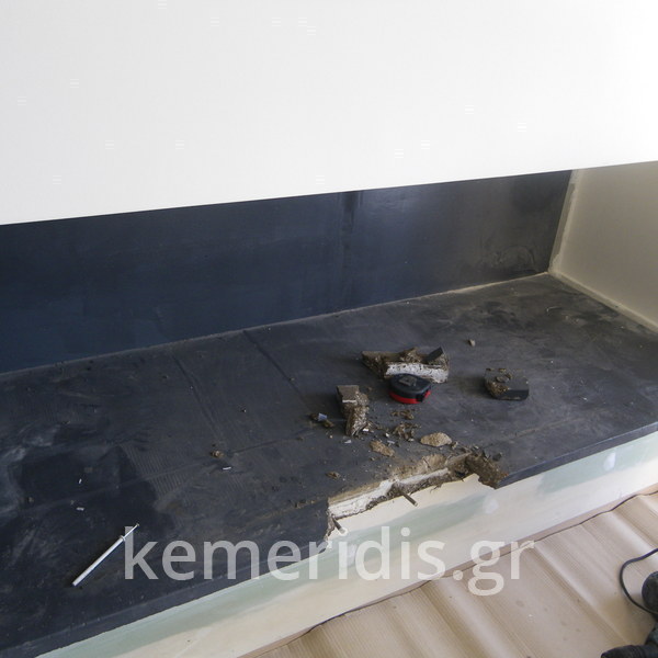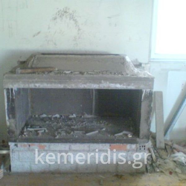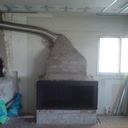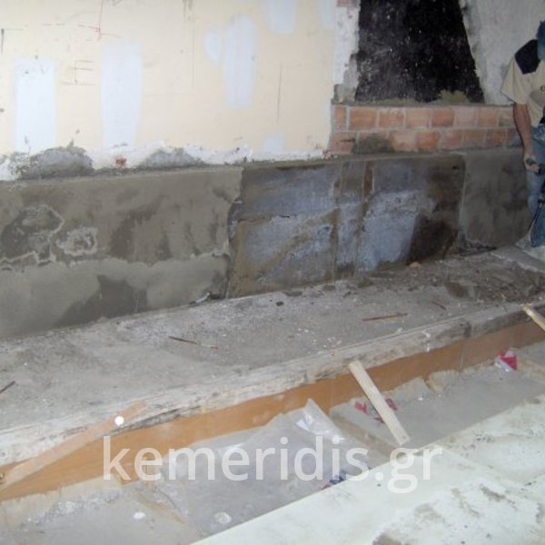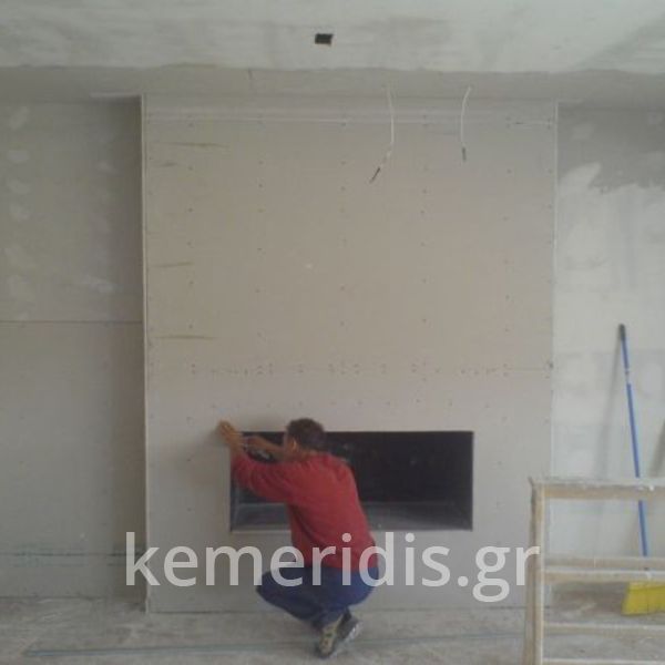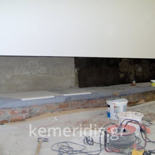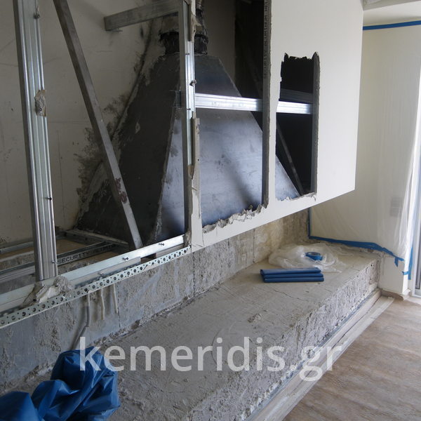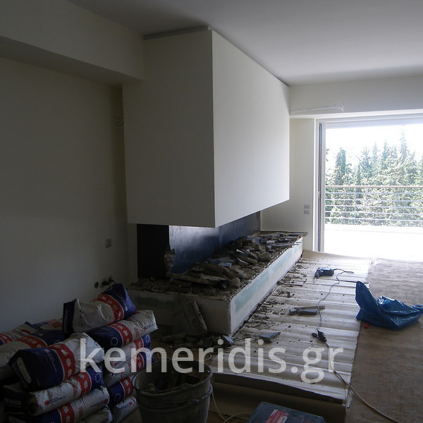 Με το πέρας τον καθαιρέσεων τοποθετήσαμε στο τοίχο ειδική θερμομονωτική πλάκα ceramic board 1000 βαθμούς C αντίσταση και κατασκευή του μπετόν από πυρίμαχο τσιμέντο και θρυμματισμένο πυρότουβλο (chamotte), κατασκευή κτιστού αεροθαλάμου με θερμομόνωση της ανοξείδωτης καμινάδας, και φούσκα από διπλή πυράντοχη γυψοσανίδα, τέλος στοκάρισμα με πυράντοχο υλικό για να δώσει μία bronze εικόνα.