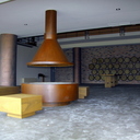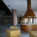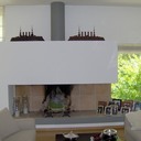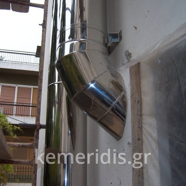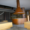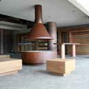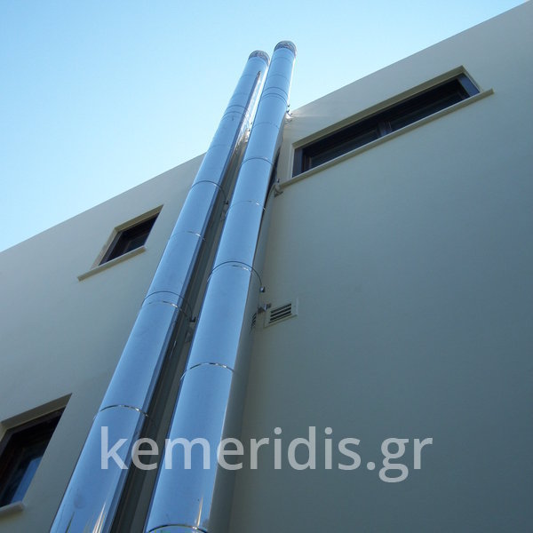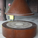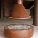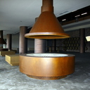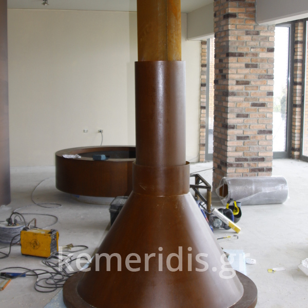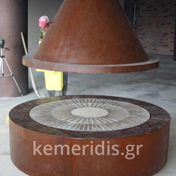 H κατασκευή έγινε με διπλή λαμαρίνα με μόνωση εσωτερικά για να μην καίει εξωτερικά, η εξωτερική λαμαρίνα έχει γίνει με επεξεργασία τύπου “Corten” οξειδωμένος (σκουριασμένος) χάλυβας, και είναι αναρτημένο από την οροφή, στην βάση έχουν τοποθετηθεί πυρότουβλα σε ακτινωτή διάταξη.