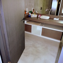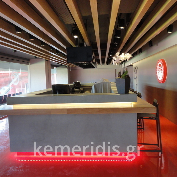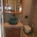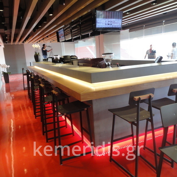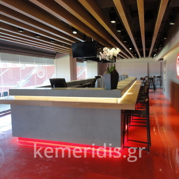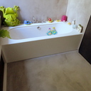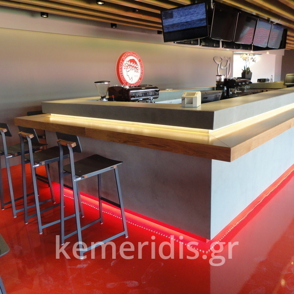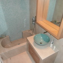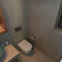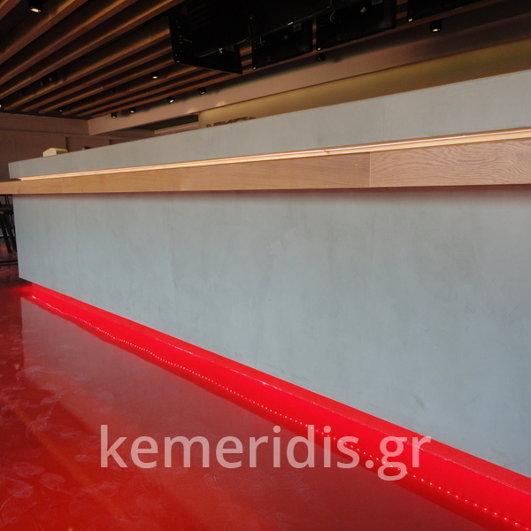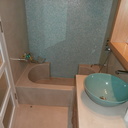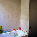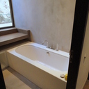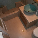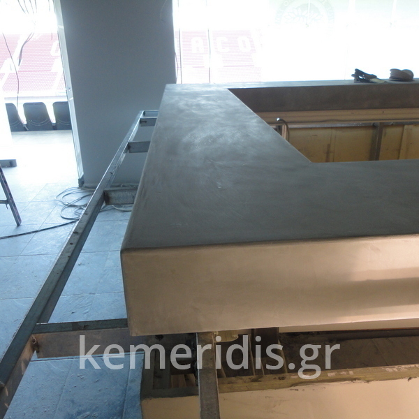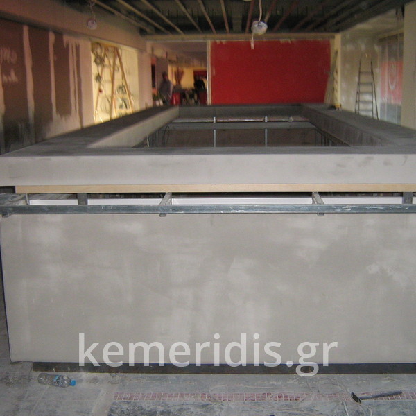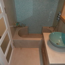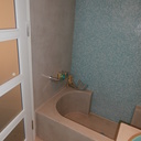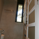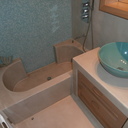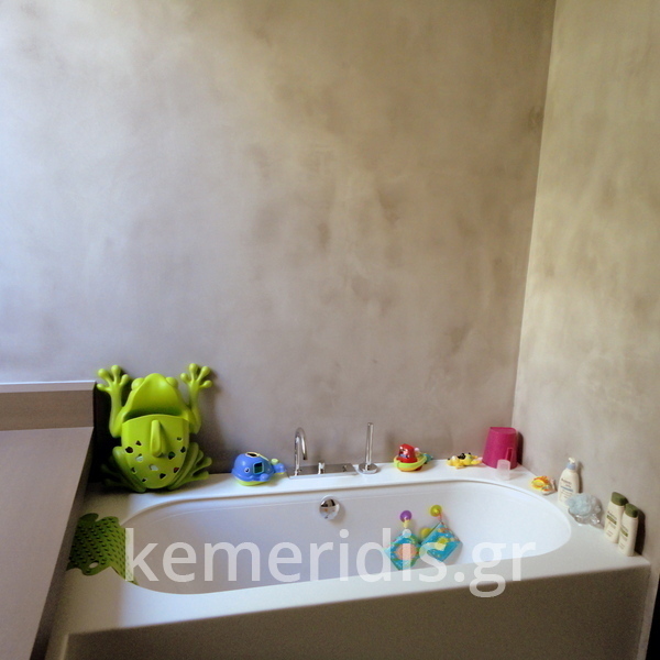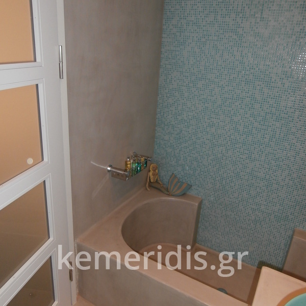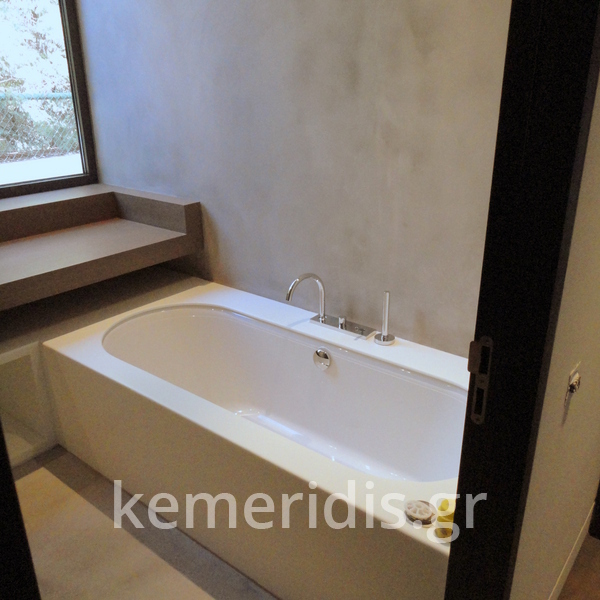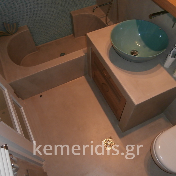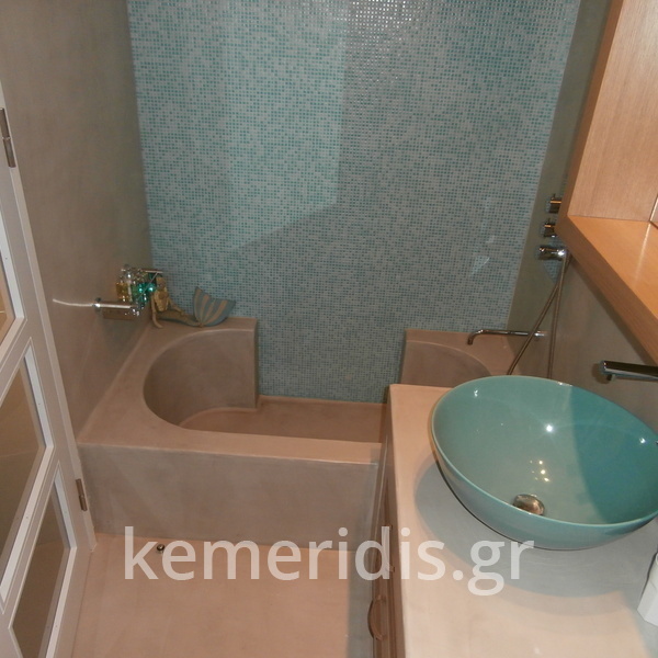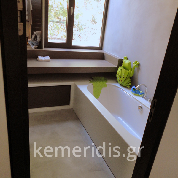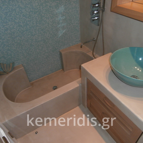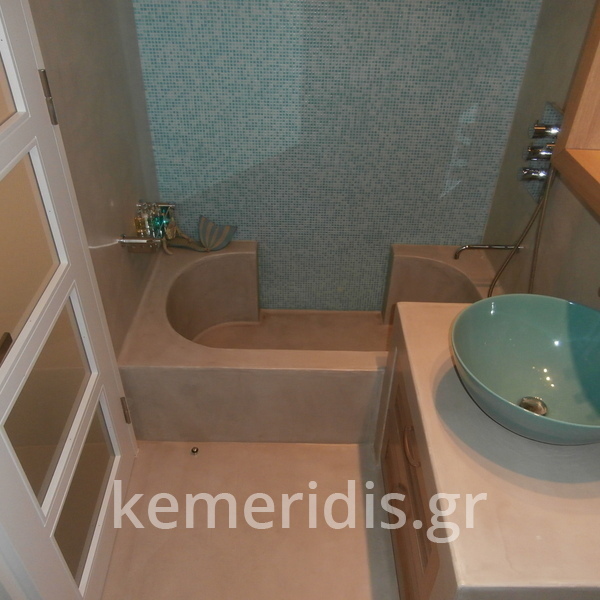 Πατητή τσιμεντοκονία σε όλο το μπάνιο, κατασκευή πάγκου νιπτήρα, και κατασκευή κτιστής μπανιέρας με επικάλυψη τσιμεντοκονίας.