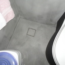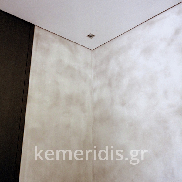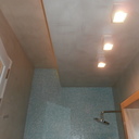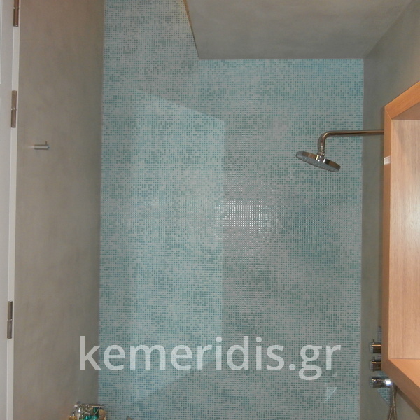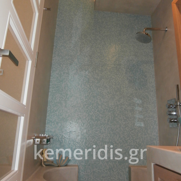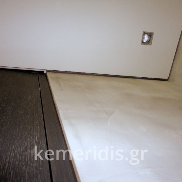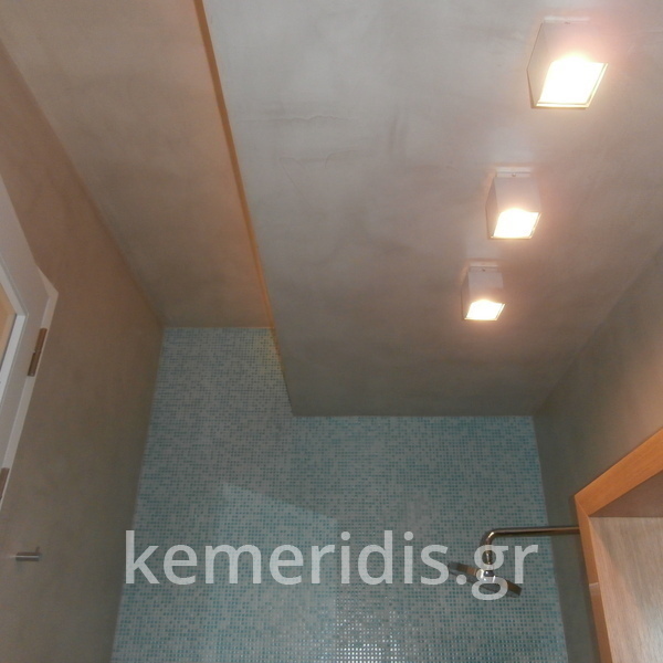 τσιμεντοκονία σε μπάνιο, στην ντουζιέρα, με σκωτίες στο δάπεδο και την οροφή, στο δάπεδο μεταξύ των πατωματων διαχωρισμός με ανοξείδωτη λάμα