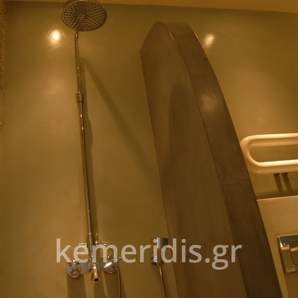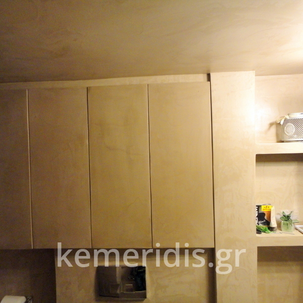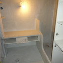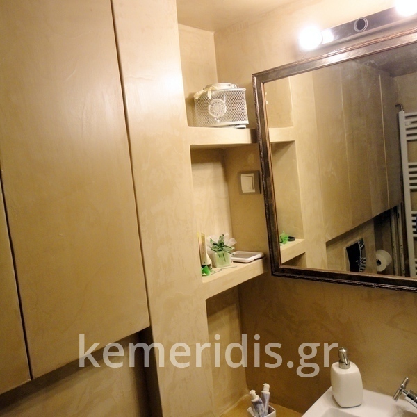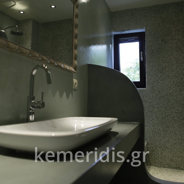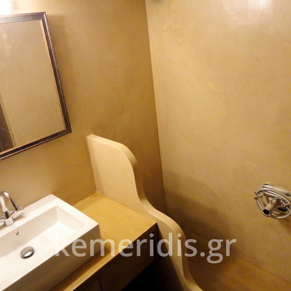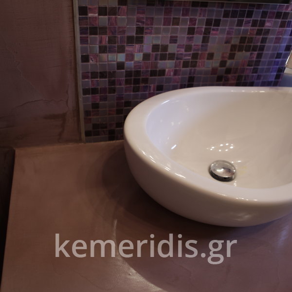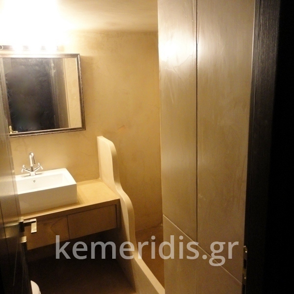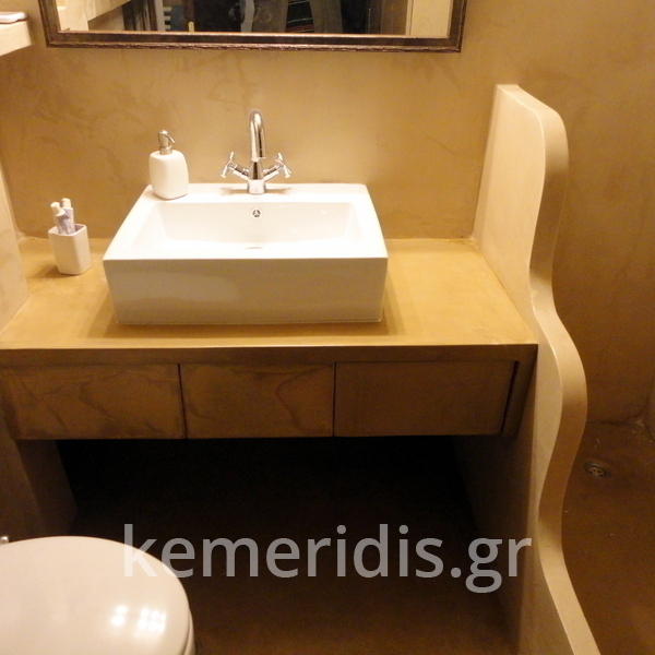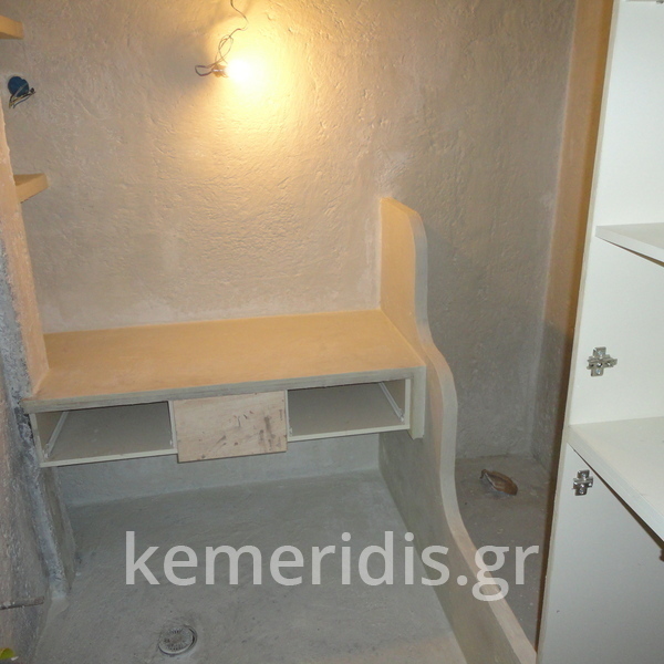 Σε μπάνιο που ανακαινίσαμε πλήρως, κατασκευάσαμε πάγκο, ντουζιέρα και ντουλάπια από κοντραπλακέ θαλάσσης , κατόπιν στεγανοποιήσαμε όλες τις επιφάνειες, και τελικά τοποθετήσαμε σε όλες τις επιφάνειες πατητή τσιμεντοκονία.