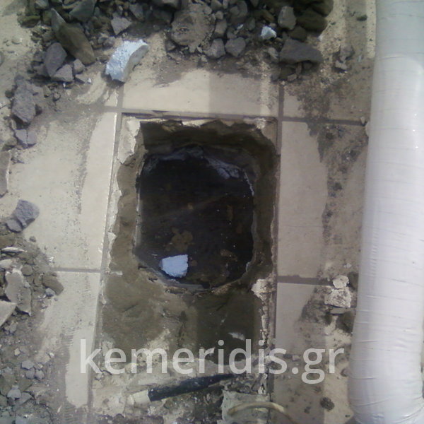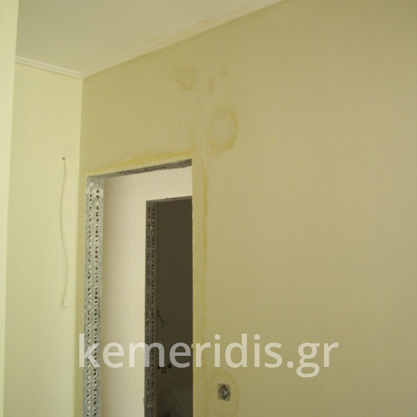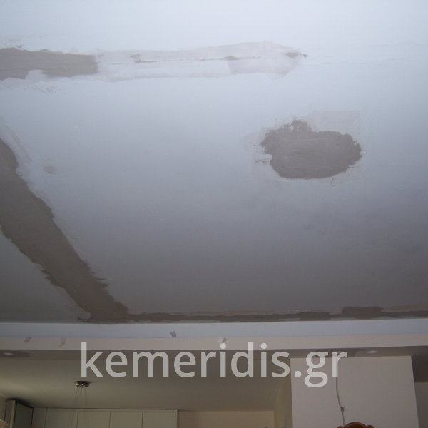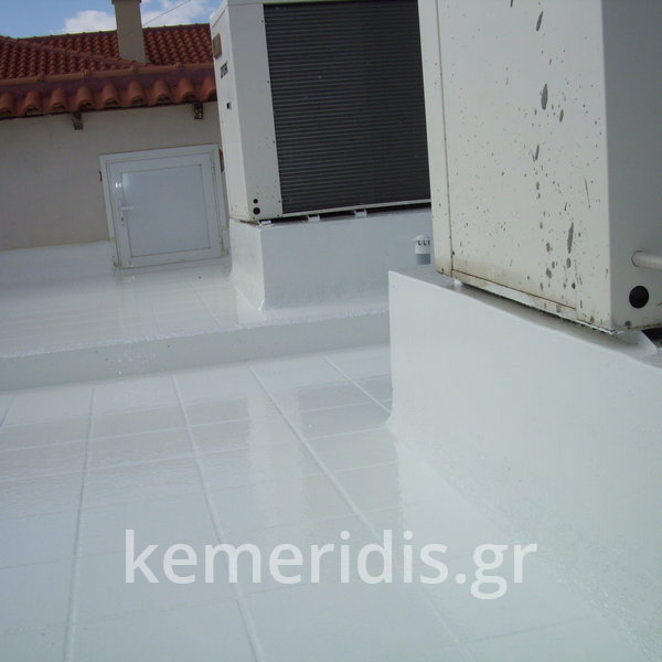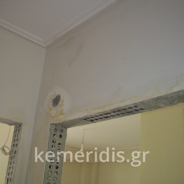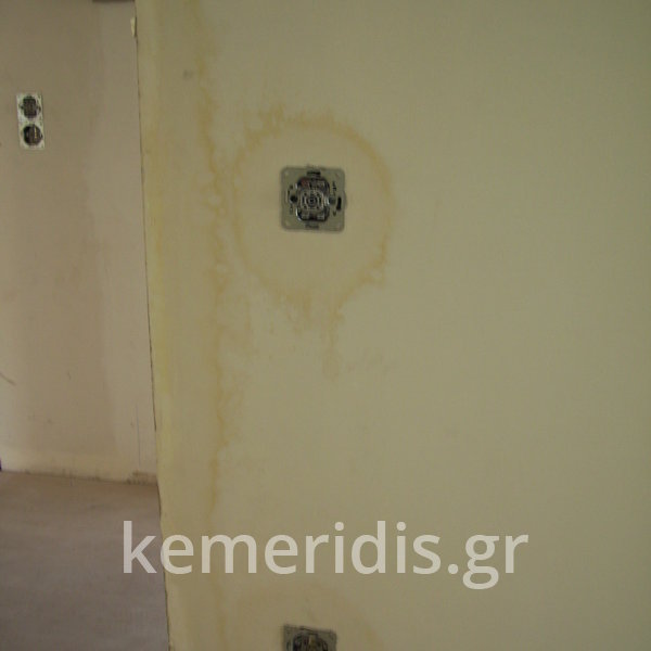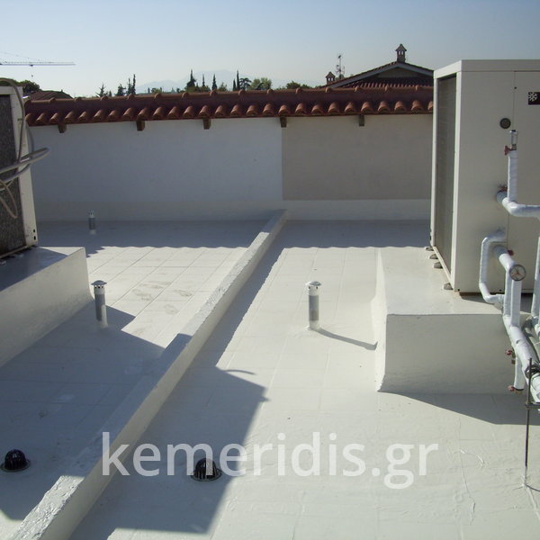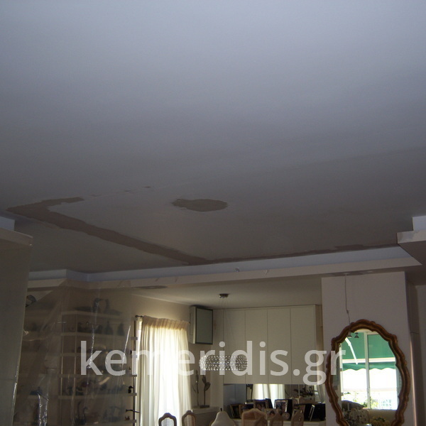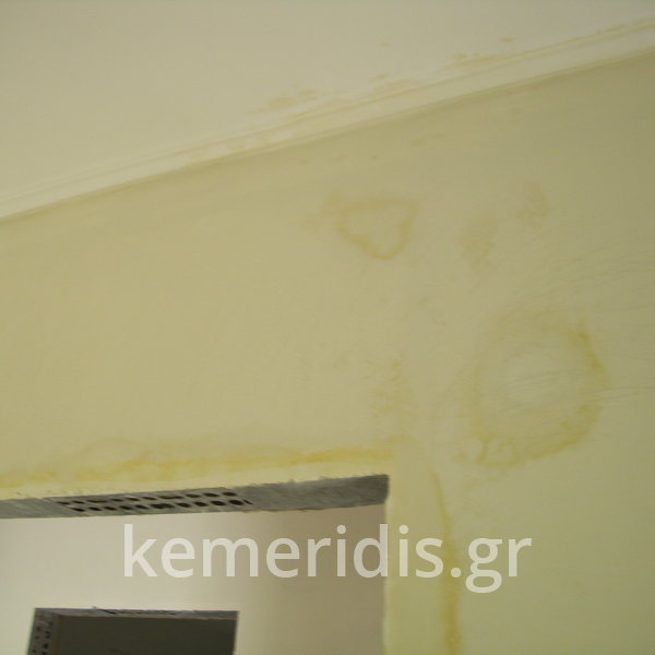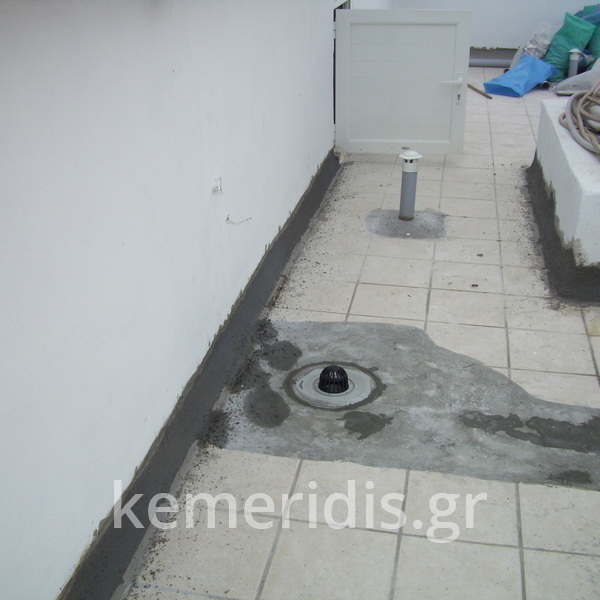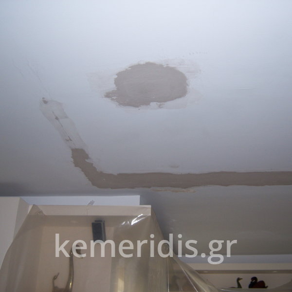 Σε νέα κατοικία λίγο πριν τοποθετηθούν τα πατώματα  παρουσιάσθηκαν προβλήματα από νερά που εσταζαν από την οροφή,τα κουτιά διακλάδωσεις των καλωδίων, και από διακόπτες & πρίζες. Μετά από αυτοψία διαπιστώσαμε ότι το νερό είχε περάσει κάτω από τα πλακάκια, το ασφαλτόπανο, & την θερμομόνωση λόγω κακοτεχνίας (κακή τοποθέτηση των απορροών ταράτσας, λάθος επιλογή στόκου των πλακιδίων, λάθος τοποθέτησης του ασφαλτόπανου). Το νερό είχε σωρευτεί στην πλάκα & από εκεί μέσω οπών των ηλεκτρολόγων και των σωλήνων των καλωδίων κατέληγε στο υπνοδωμάτιο από κάτω. Η λύση πού δώσαμε ήταν να τοποθετήσουμε νέες κατάλληλες υδρορροές με σωστό τρόπο, αποξήλωση των σοβατεπιών & κατασκευή καμπύλου λουκιού περιμετρικά, αφαίρεση όσο νερό ήταν δυνατόν & τοποθέτηση εξαεριστικών για να στεγνώσει το υπόλοιπο, εγκιβωτισμό των σωληνώσεων με στεγανό μπετόν, & επάλειψη τελική με ειδική πολυουρεθανική μεμβράνη.