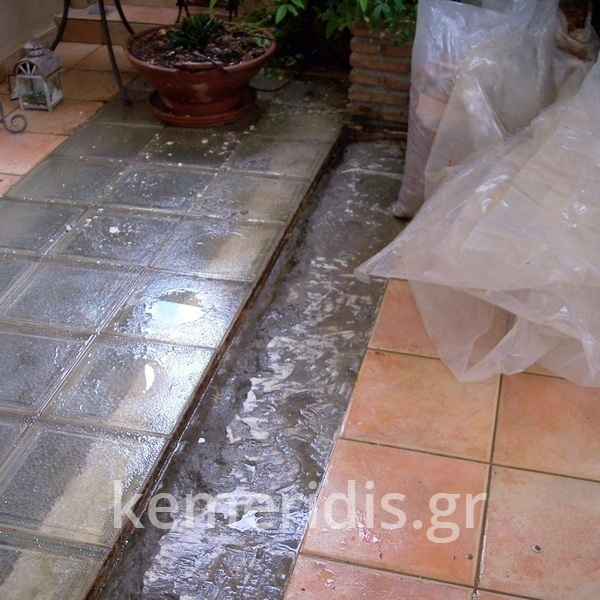 Αποκατάσταση της στεγανοποίησης στην βεράντα του κήπου σε συγκρότημα κατοικιών που προκάλεσαν προβλήματα στο υπόγειο της κατοικίας λόγω κακής στεγανοποίησης του σκελετού τοποθέτησης των υάλινων πλακιδίων.