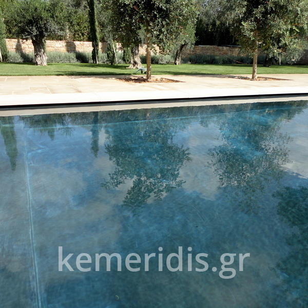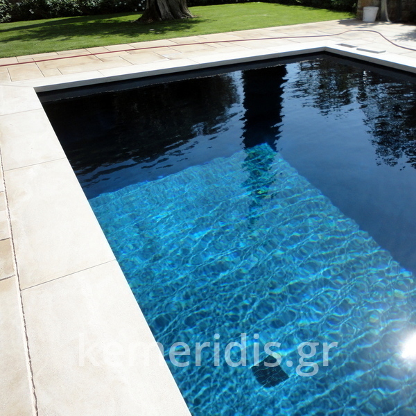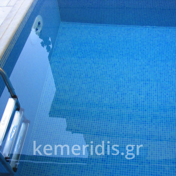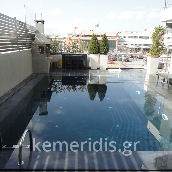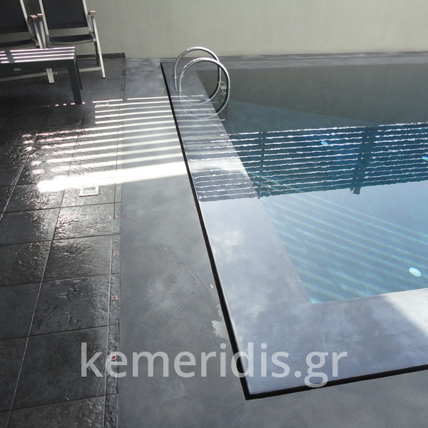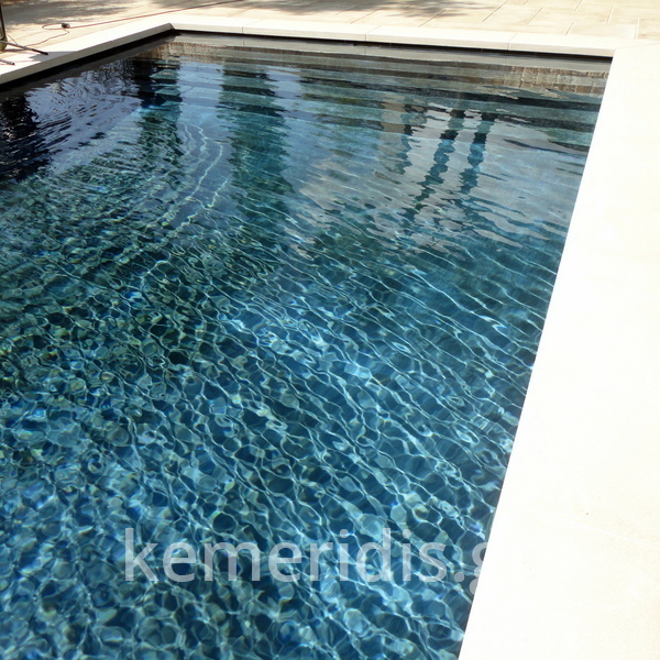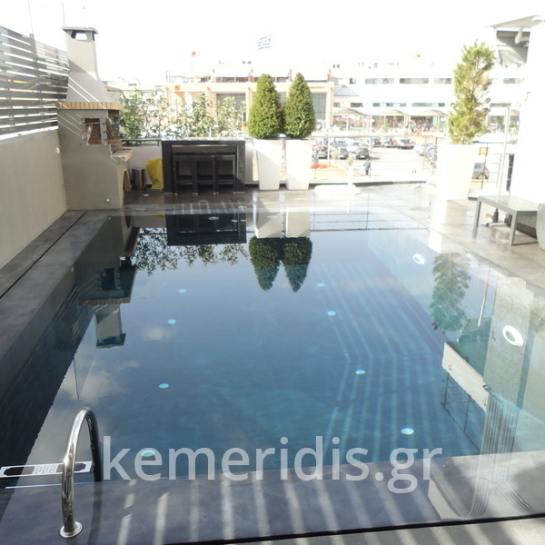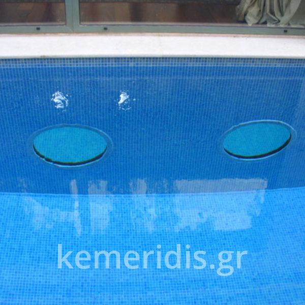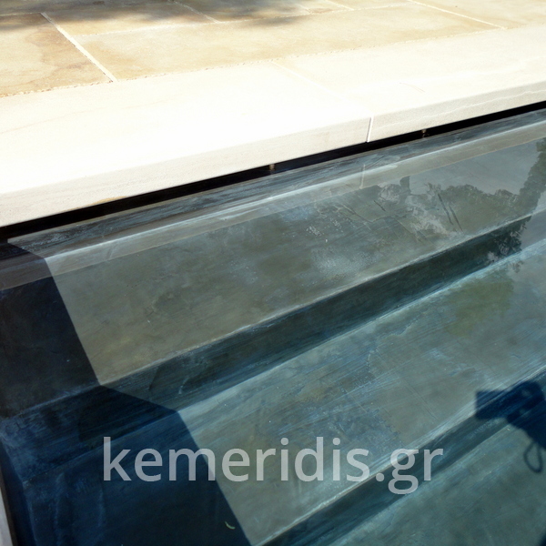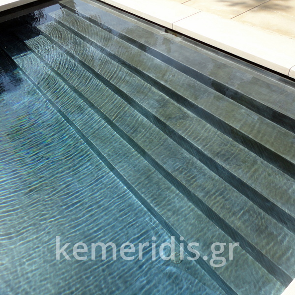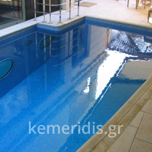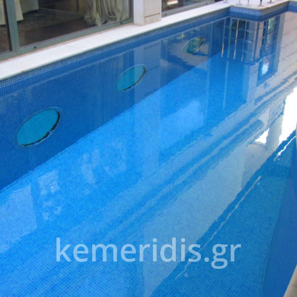 πισίνα με τρία τζάμια για φωτισμό του υπογείου, επένδηση με ψηφίδα στα τοιχία & τον πυθμένα & μαρμάρινα επιχείλια.