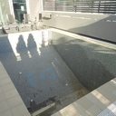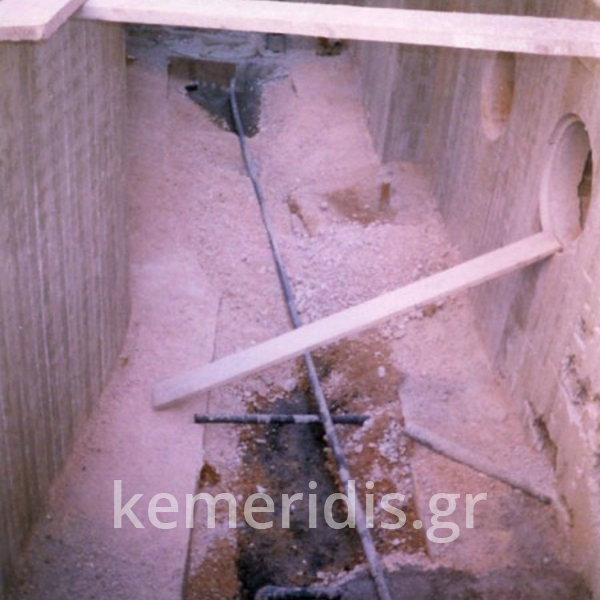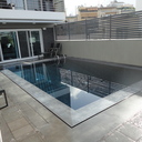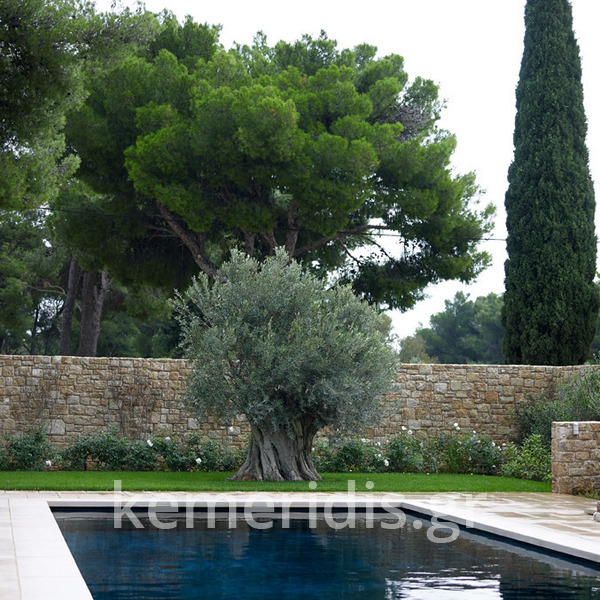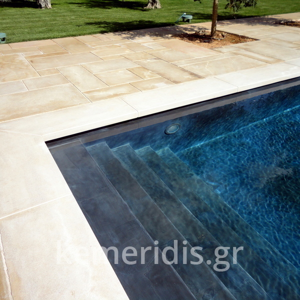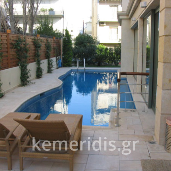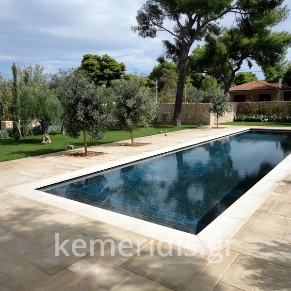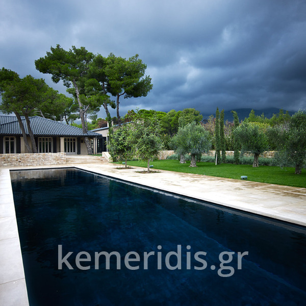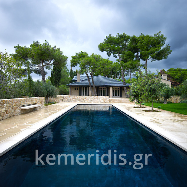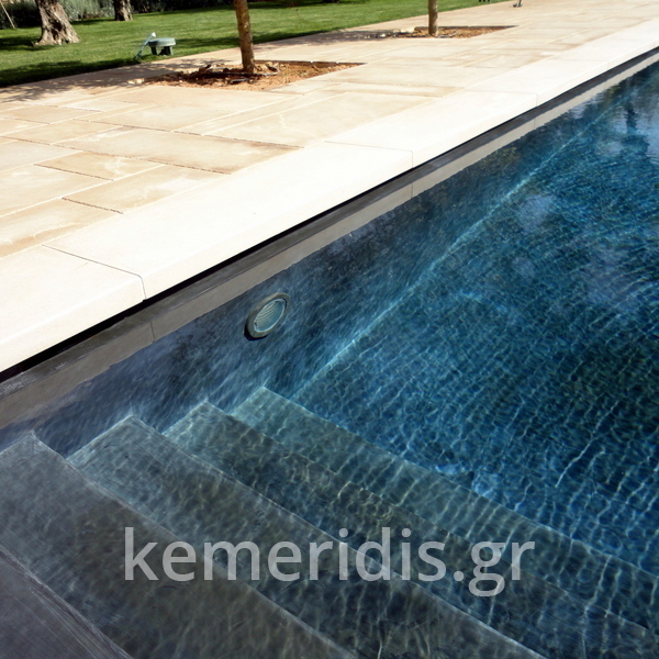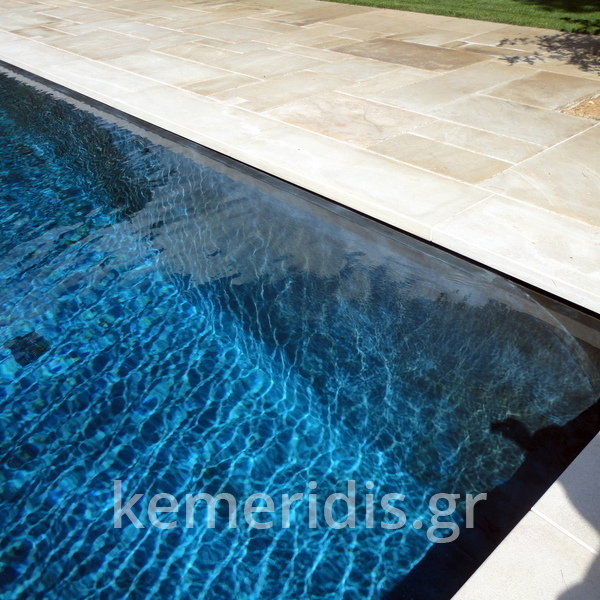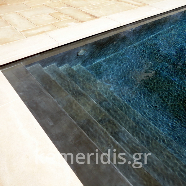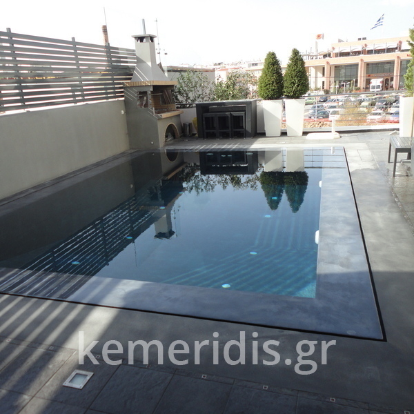 πισίνα με τρία τζάμια για φωτισμό του υπογείου, επένδηση με ψηφίδα στα τοιχία & τον πυθμένα & μαρμάρινα επιχείλια.
