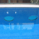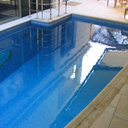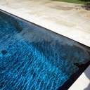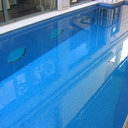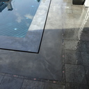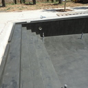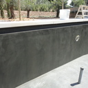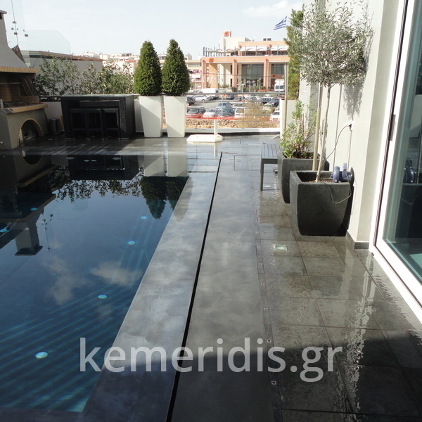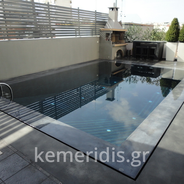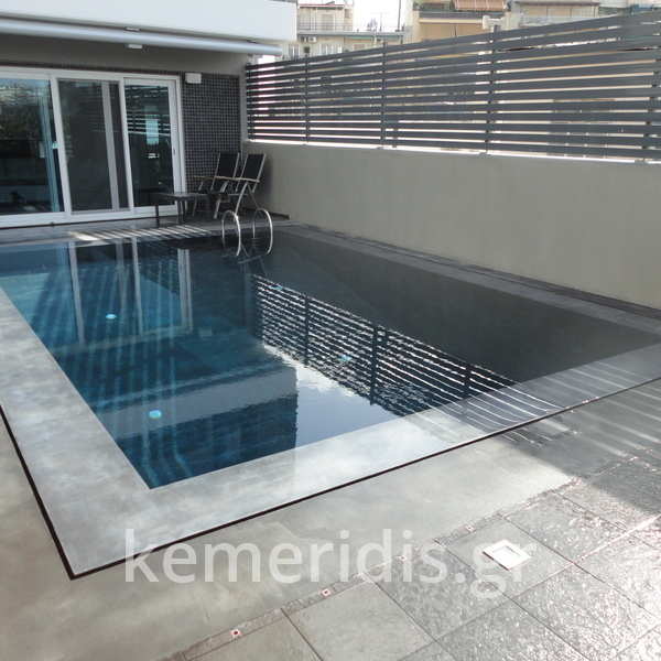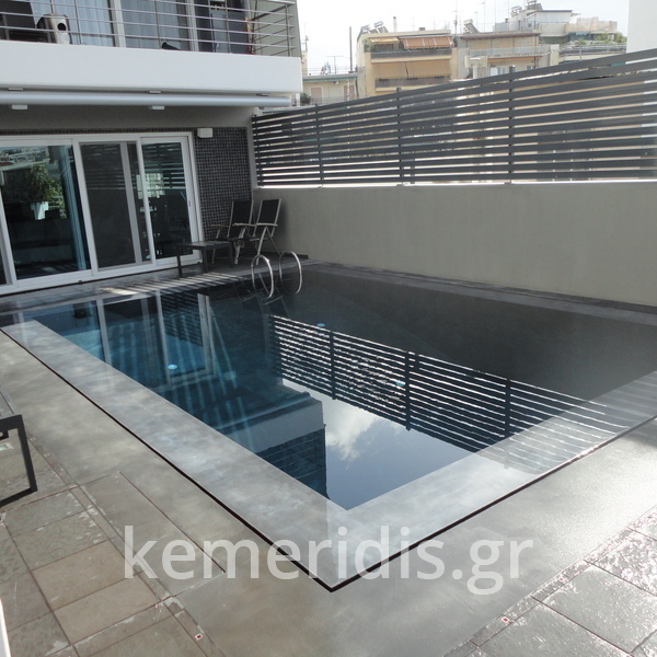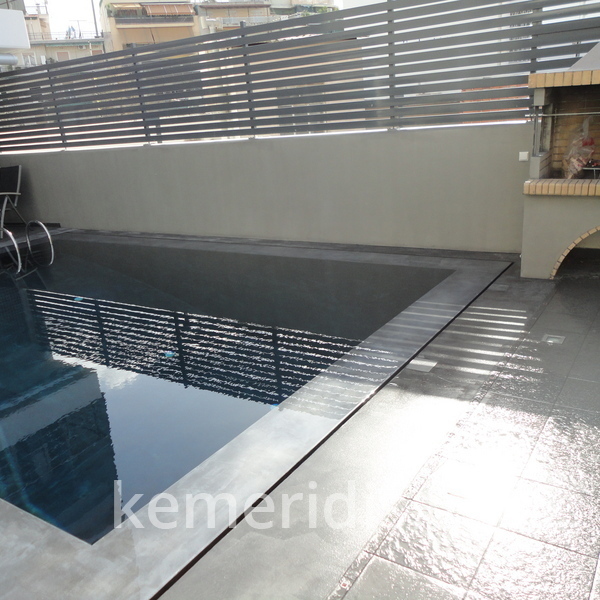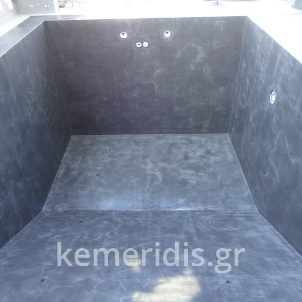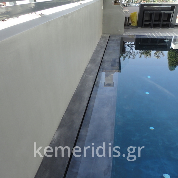Στεγανοποίηση - σοβάτισμα - και αρχιτεκτονική τσιμεντοκονία (πατητή τσιμεντοκονία) σε πισίνα. η πισίνα είναι με υπερχείλιση με πατούρα για σκέπαστρο συρόμενο που την μετατρέψαμε με δική μας πατέντα για να ανεβάσουμε το ύψος του νερού, η τσιμεντοκονία είναι ειδικού τύπου για πισίνες σε σκούρο γκρι χρώμα αλλά όπως βλέπετε με το νερό αλλάζει η απόχρωση ιδίως στο βαθύ μέρος της πισίνας.