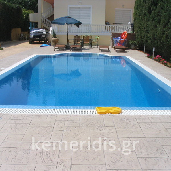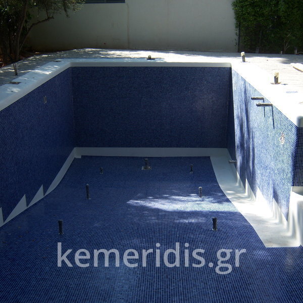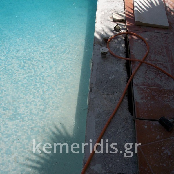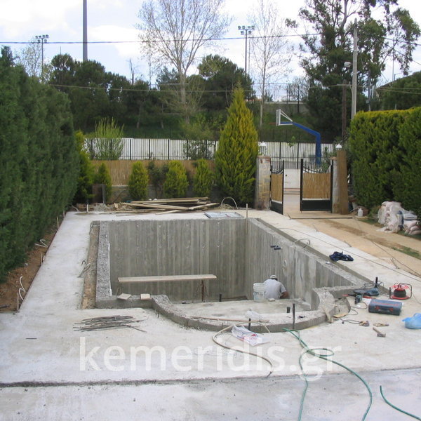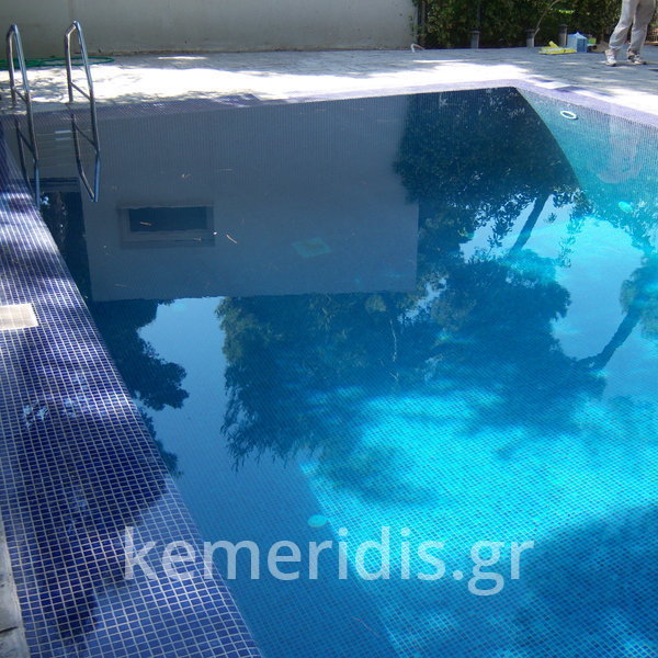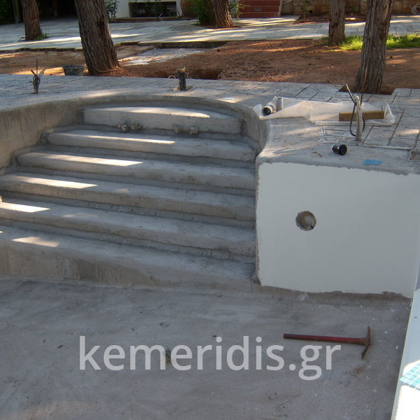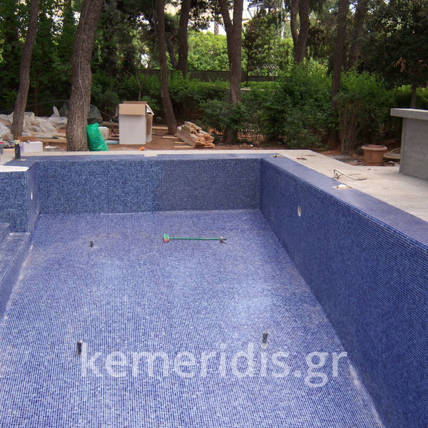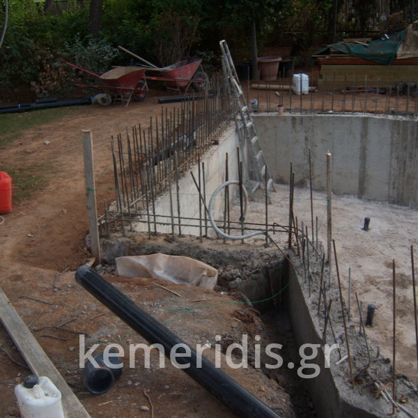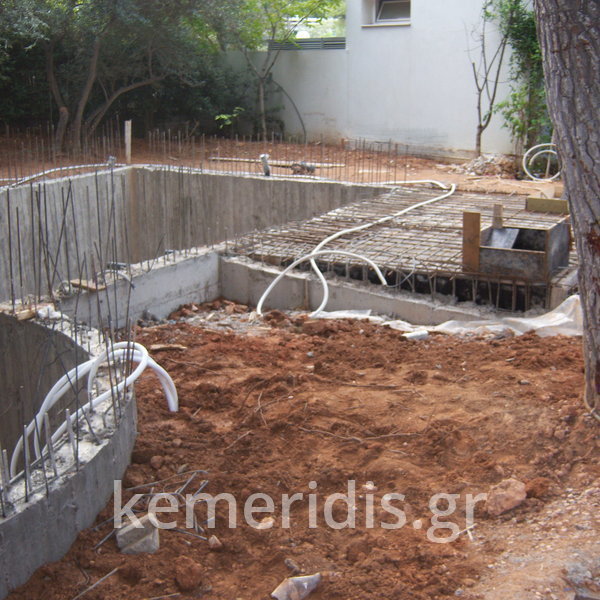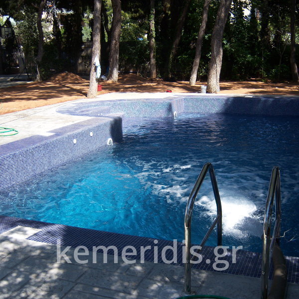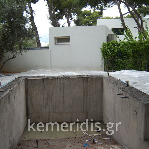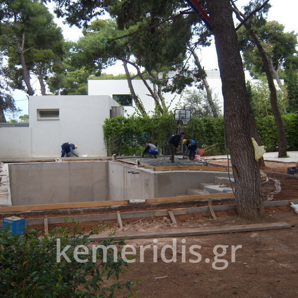 Κατασκευή πισίνας με υπερχείλιση, το έργο αφορούσε όλες τις εργασίες κατασκευής πισίνας: εκσκαφή, κατασκευή μπετόν, στεγανοποίηση, μηχανολογικός εξοπλισμός, τοποθέτηση ψηφίδας, διαμόρφωση περιβάλλοντος χώρου. Η υπερχείλιση έγινε over flow ( τοπικών απορροών ) επειδή υπήρχαν πολλά δένδρα για ευκολία στο καθάρισμα των φύλλων, η σκάλα τοποθετήθηκε στο πλάι σε κυκλικό σχήμα με στόμια υδρομασάζ, εσωτερικά τοποθετήθηκε ψηφίδα, & στον περιβάλλοντα χώρο σταμπωτό μπετό, & γκαζόν.