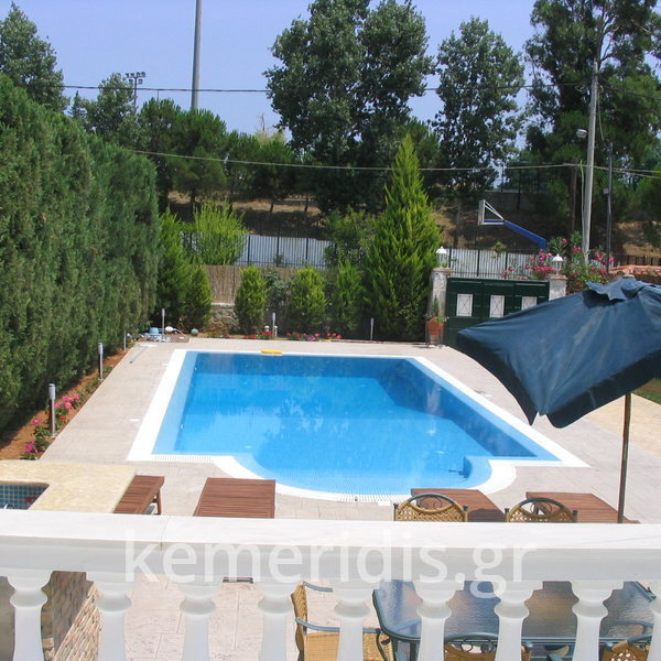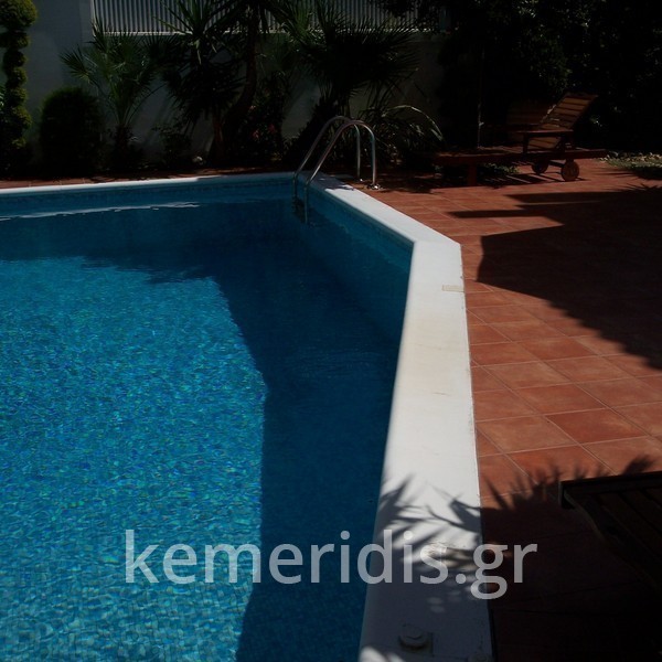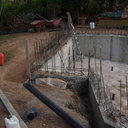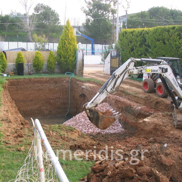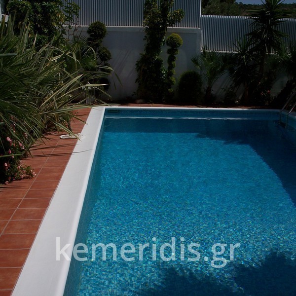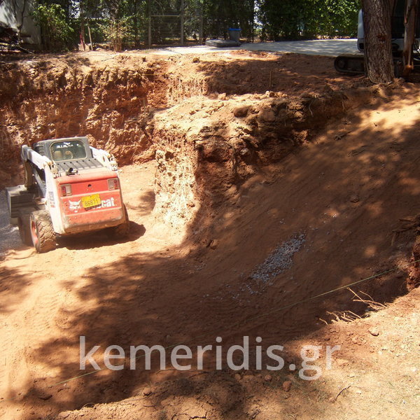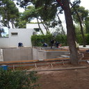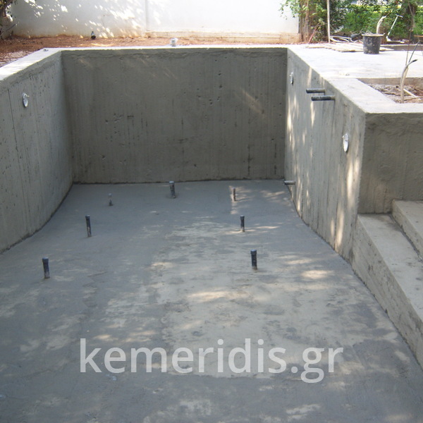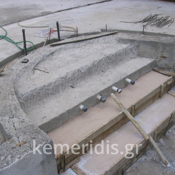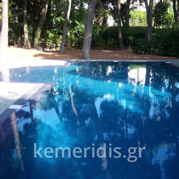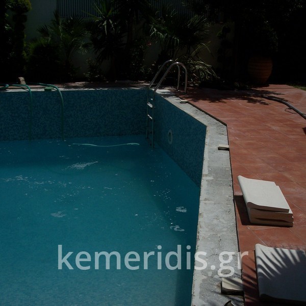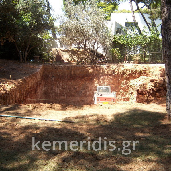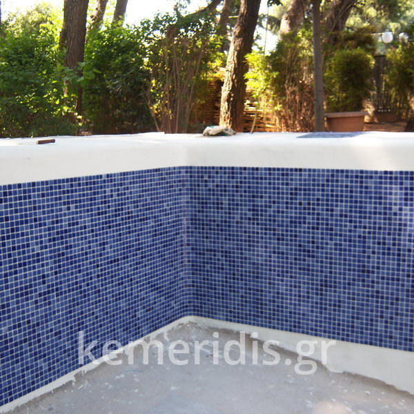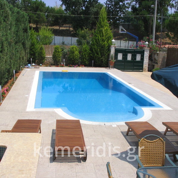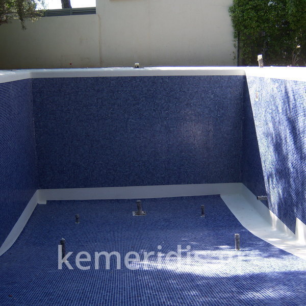 Κατασκευή πισίνας με υπερχείλιση, το έργο αφορούσε όλες τις εργασίες κατασκευής πισίνας: εκσκαφή, κατασκευή μπετόν, στεγανοποίηση, μηχανολογικός εξοπλισμός, τοποθέτηση ψηφίδας, διαμόρφωση περιβάλλοντος χώρου. Η υπερχείλιση έγινε over flow ( τοπικών απορροών ) επειδή υπήρχαν πολλά δένδρα για ευκολία στο καθάρισμα των φύλλων, η σκάλα τοποθετήθηκε στο πλάι σε κυκλικό σχήμα με στόμια υδρομασάζ, εσωτερικά τοποθετήθηκε ψηφίδα, & στον περιβάλλοντα χώρο σταμπωτό μπετό, & γκαζόν.