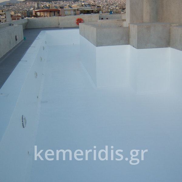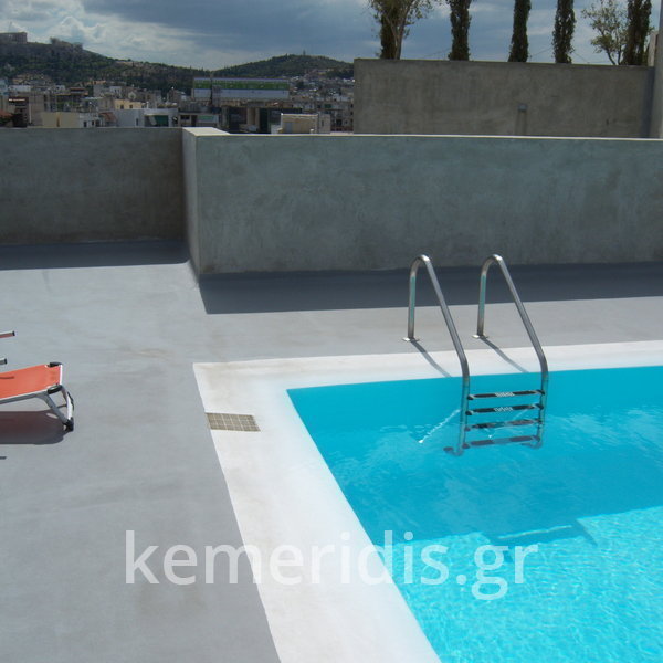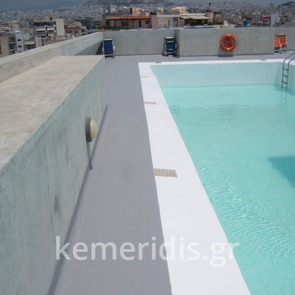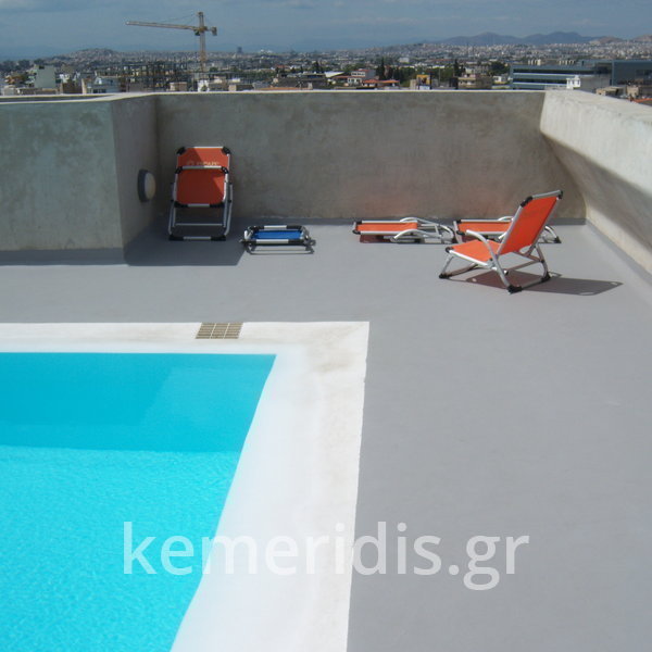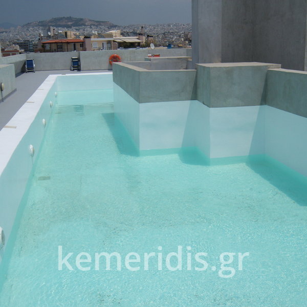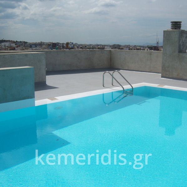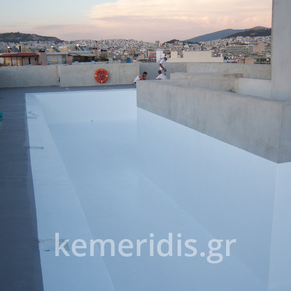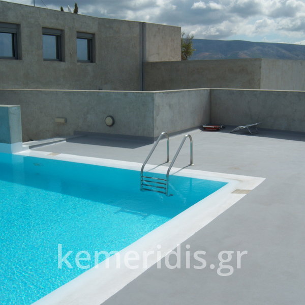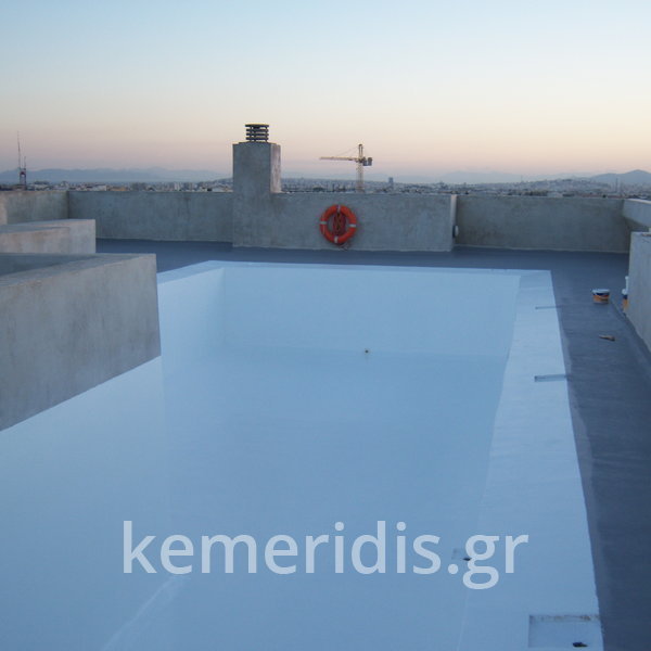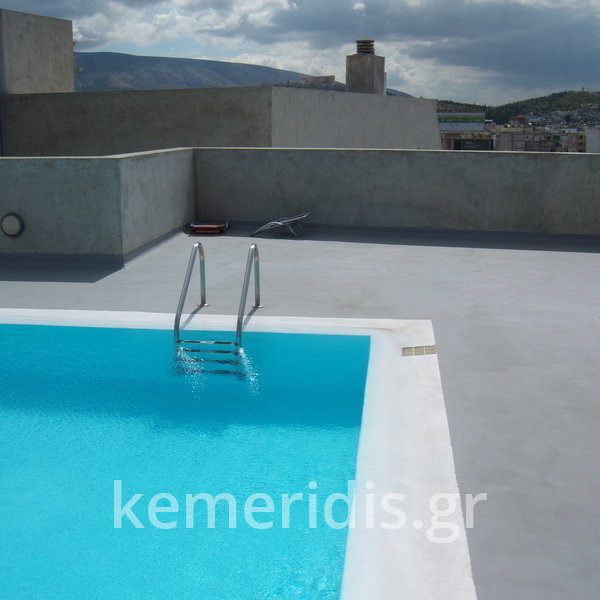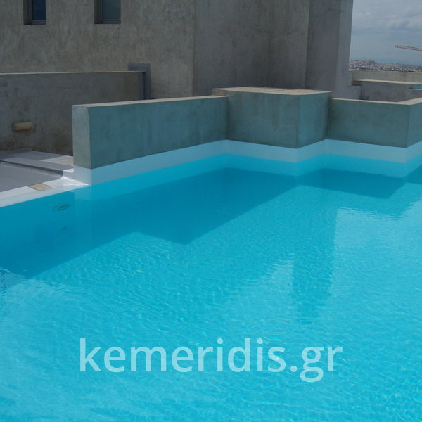 Κατασκευή πισίνας σε ταράτσα συγκροτήματος κατοικιών, με υπερχείλιση overflow (τοπικών απορροών) σε συνέχεια με τον περιβάλλοντα χώρο, με λευκό εποξειδικό χρώμα στην πισίνα και γκρί στον περιβάλλοντα χώρο, η πισίνα βρίσκετε στην οροφή του όγδοου ορόφου.