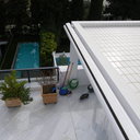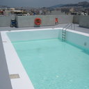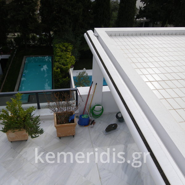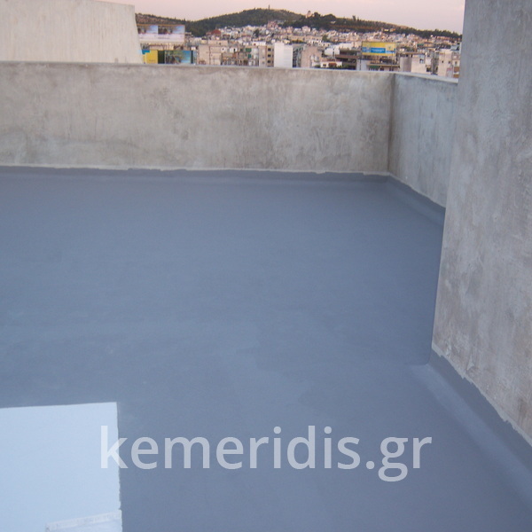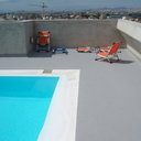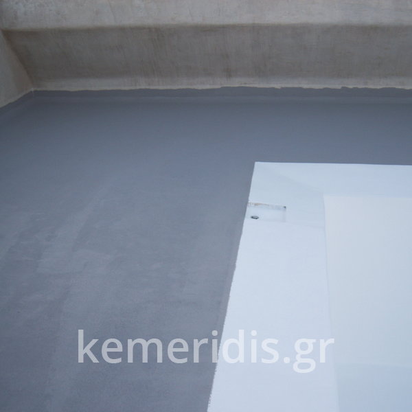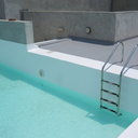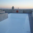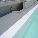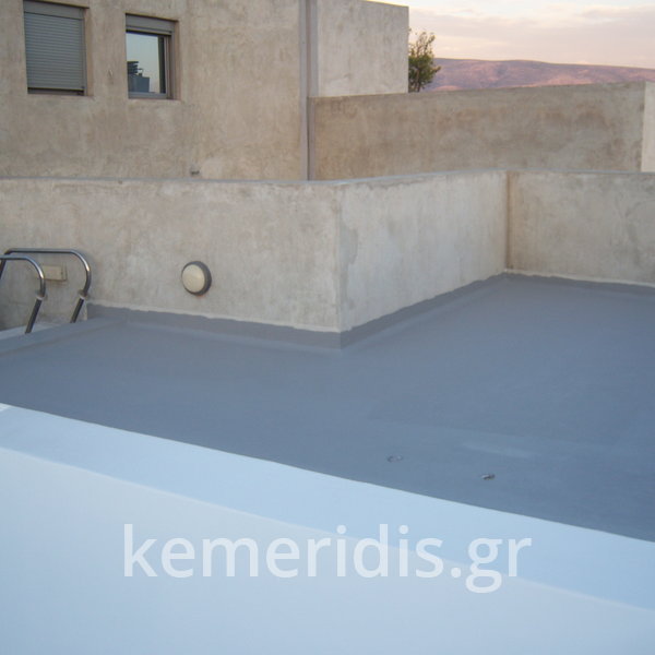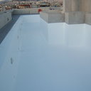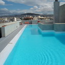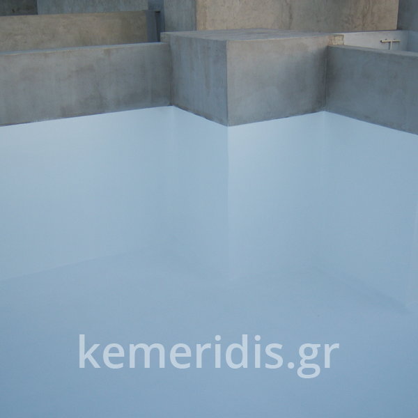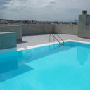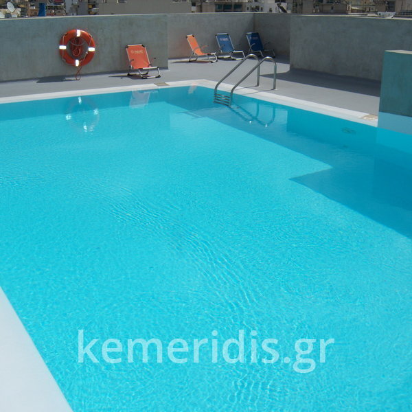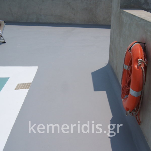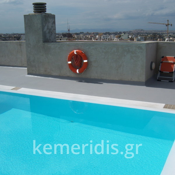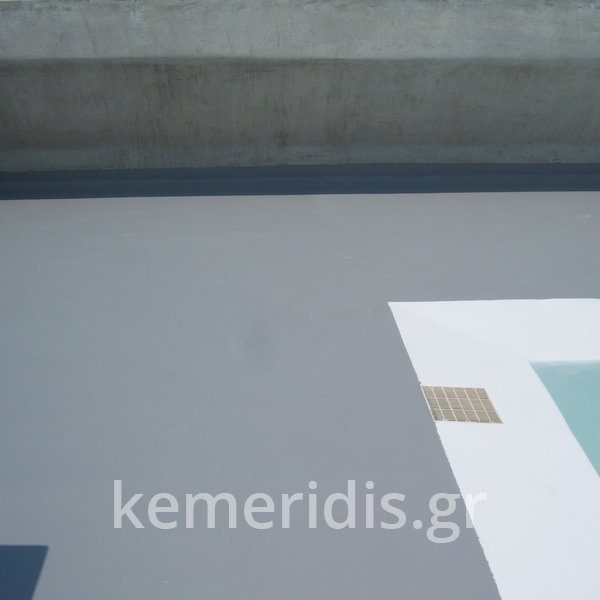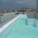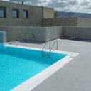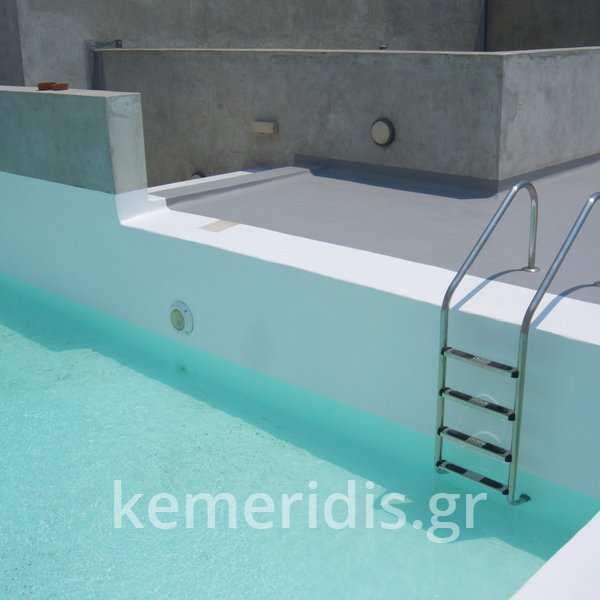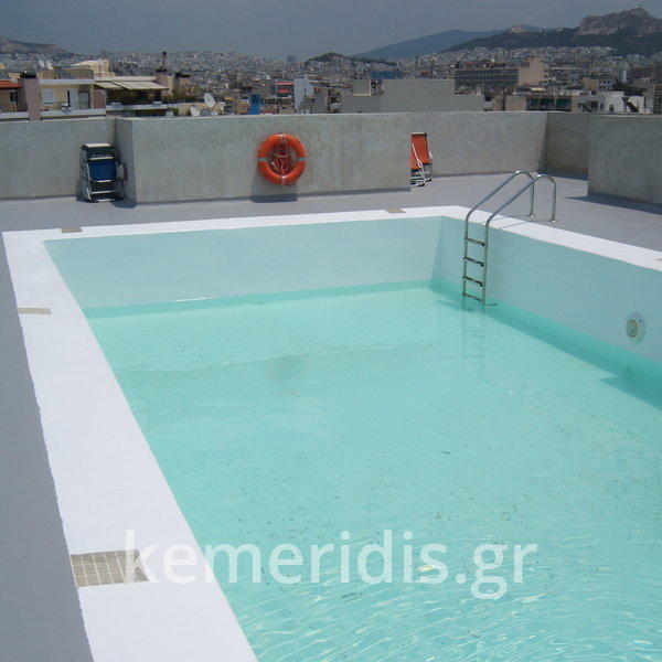 Κατασκευή πισίνας σε ταράτσα συγκροτήματος κατοικιών, με υπερχείλιση overflow (τοπικών απορροών) σε συνέχεια με τον περιβάλλοντα χώρο, με λευκό εποξειδικό χρώμα στην πισίνα και γκρί στον περιβάλλοντα χώρο, η πισίνα βρίσκετε στην οροφή του όγδοου ορόφου.