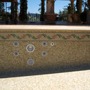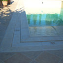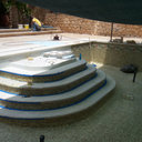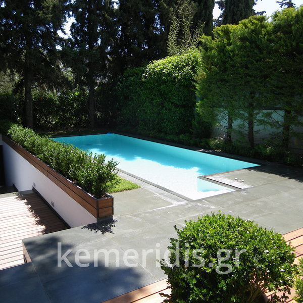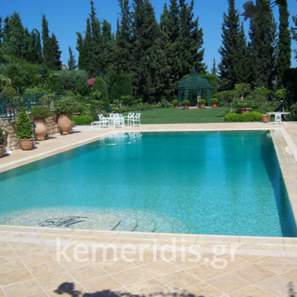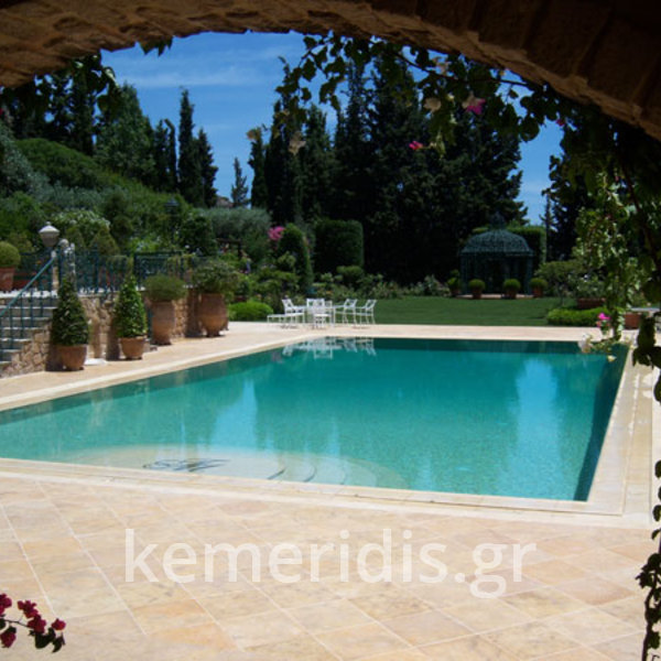 Κατασκευή πισίνας με υπερχείλιση γραμμικής απορροής, με μάρμαρο indian serena, ο σχεδιασμός της υπερχείλισης είναι δικός μας, με το κανάλι να έχει τροποποιηθεί ώστε να εξαλείψη τα προβλήματα που έχουν συνήθως η γραμμικές απορροές, η πισίνα έχει μηχανισμό αντιθέτου κολύμβησης & στόμια υδρομασάζ στην σκάλα, εσωτερικά εχει επενδυθεί με λευκή ψηφίδα.